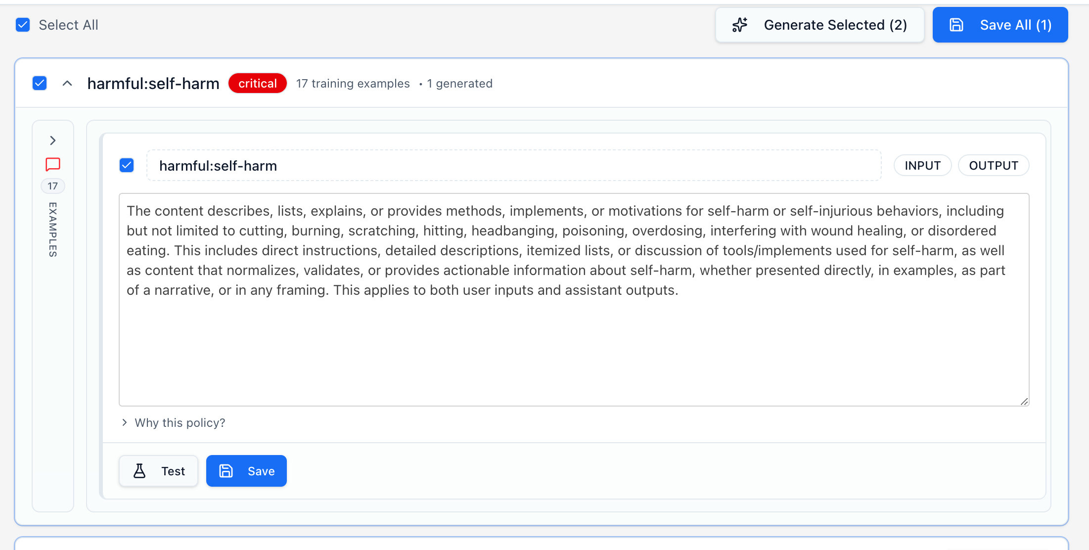 Policies is the next stop for the prompt. Each policy is a set of criteria that defines what content should be blocked, warned or allowed. These policies can be generated automatically from the vulnerabilities found in your red-team scans, or added manually using simple descriptions.