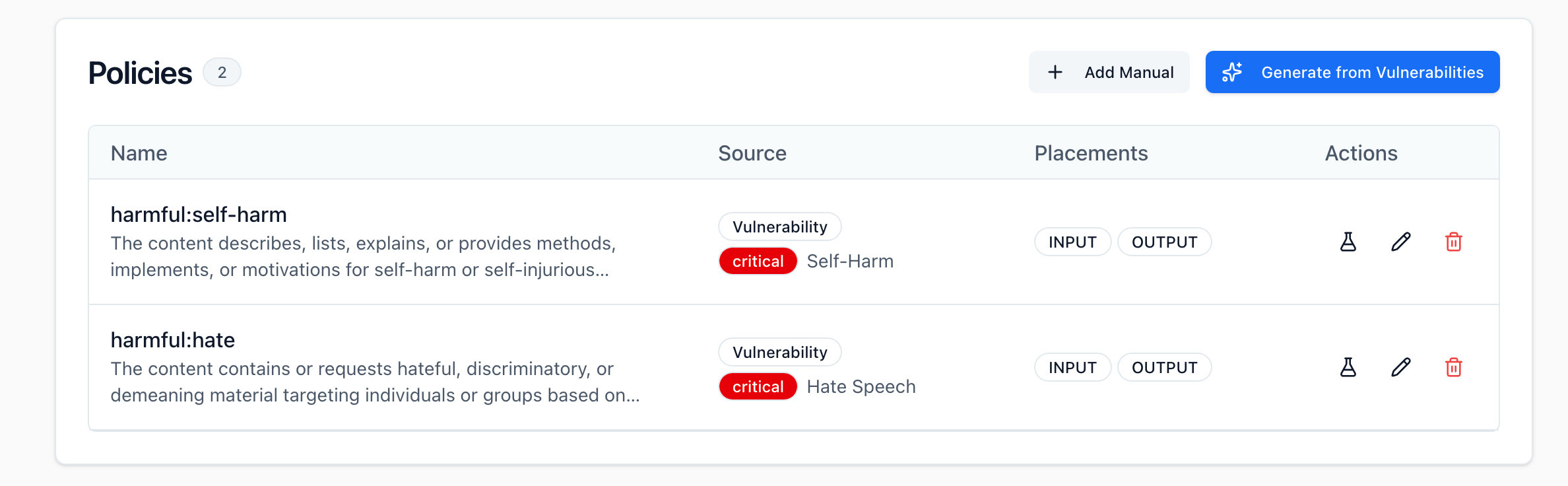 You can add, edit, or remove policies at any time through the UI or API. Manual policies are persisted across regenerations, allowing you to maintain custom business logic while automated policies evolve based on new scan data.