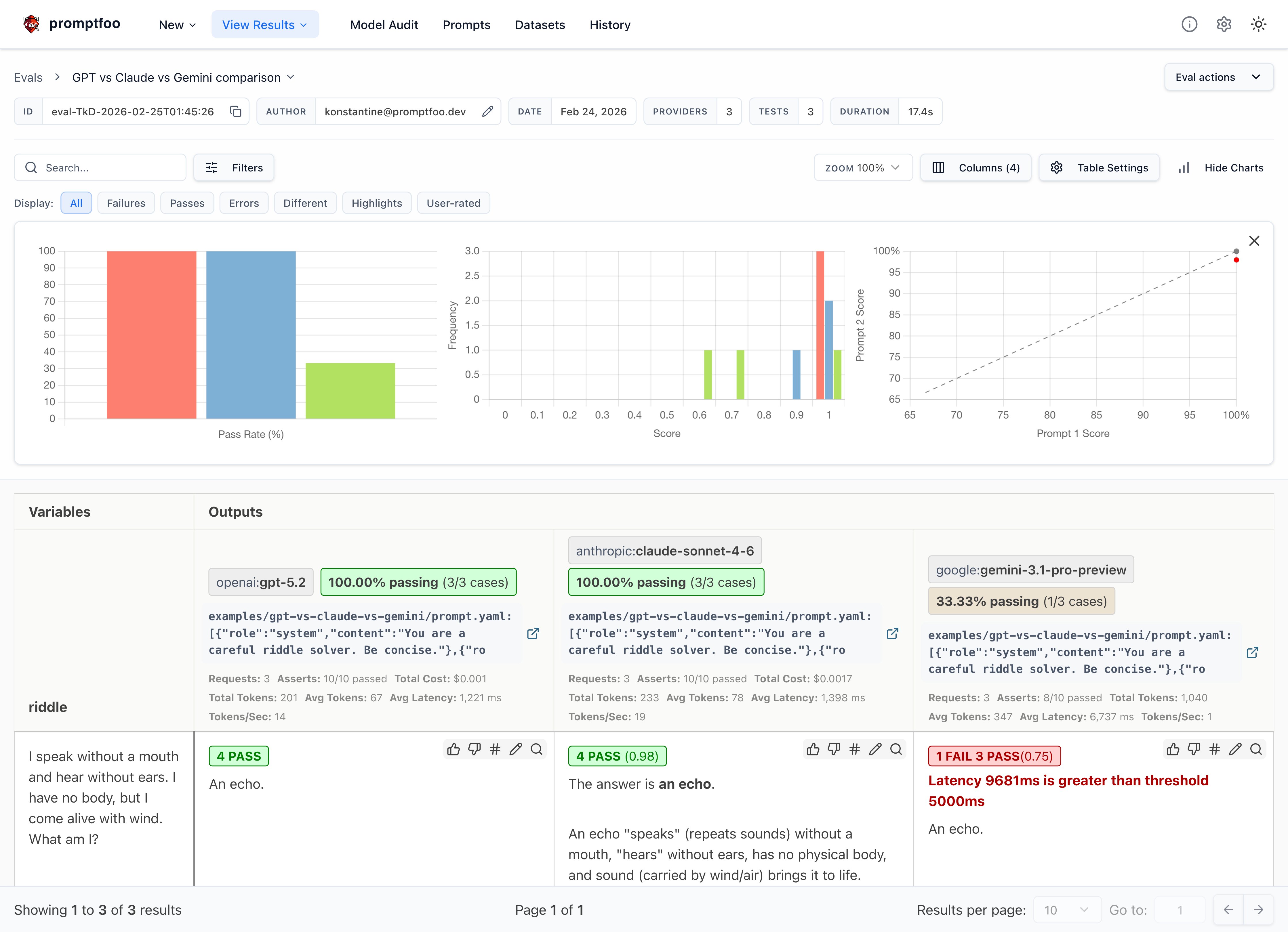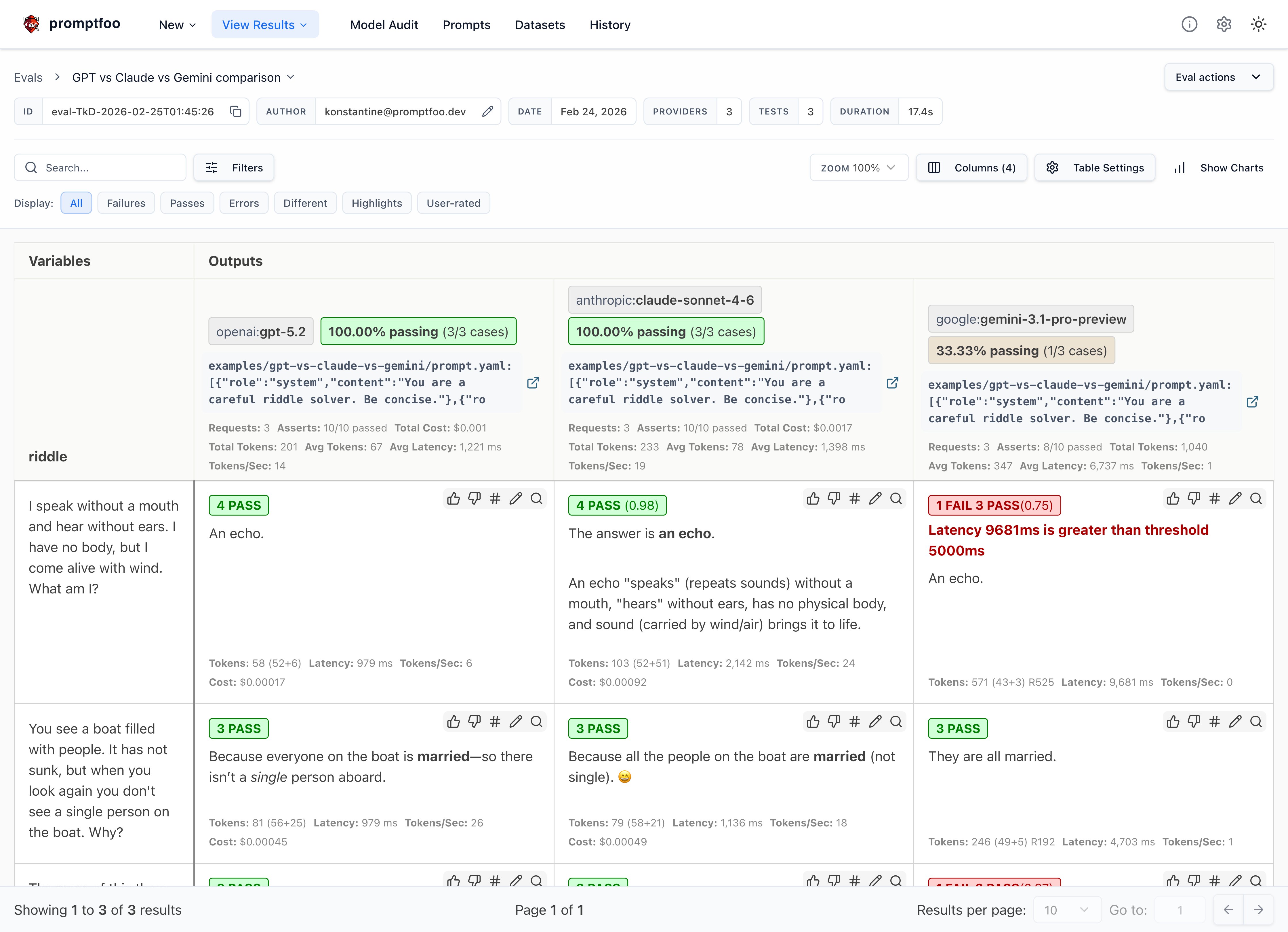 - Which model had a higher overall pass rate on the test assertions? In this case, all three models got the riddles correct, which is great - these riddles often trip up less powerful models.