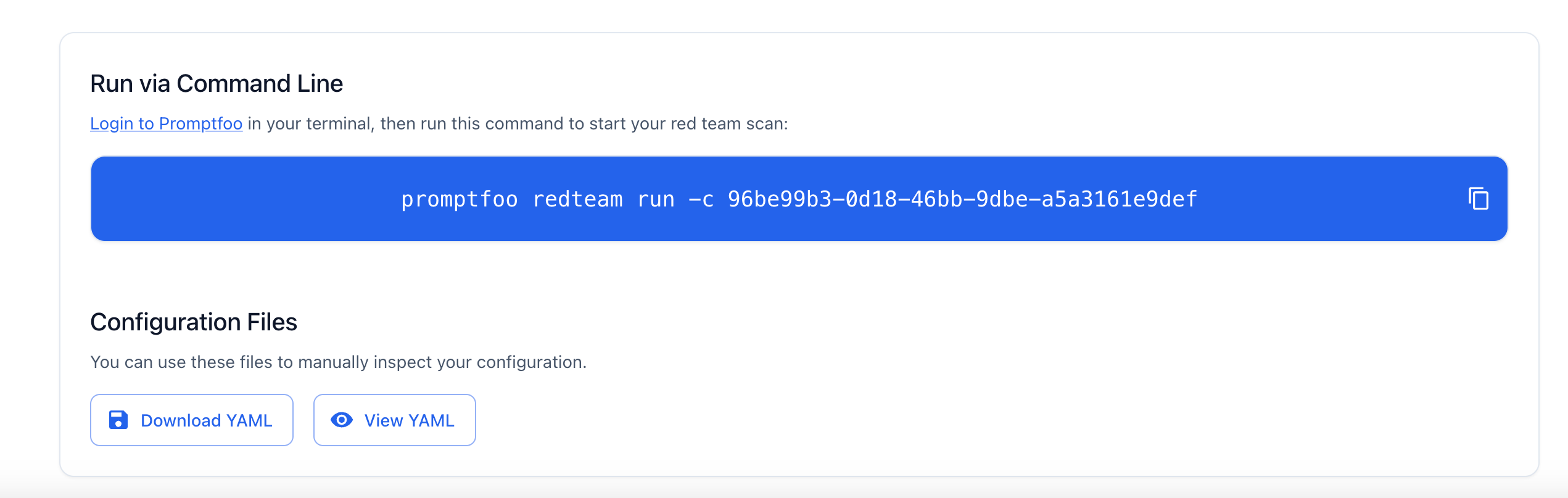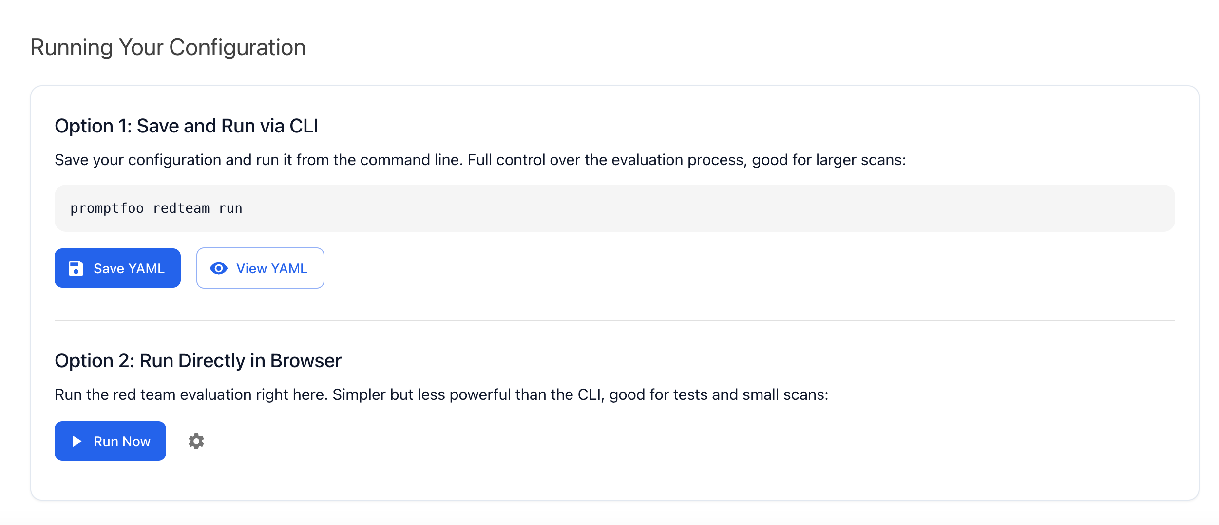 Once you complete your configuration, you can either run your scan directly in the browser or save your configuration to a YAML file and run it through the CLI.