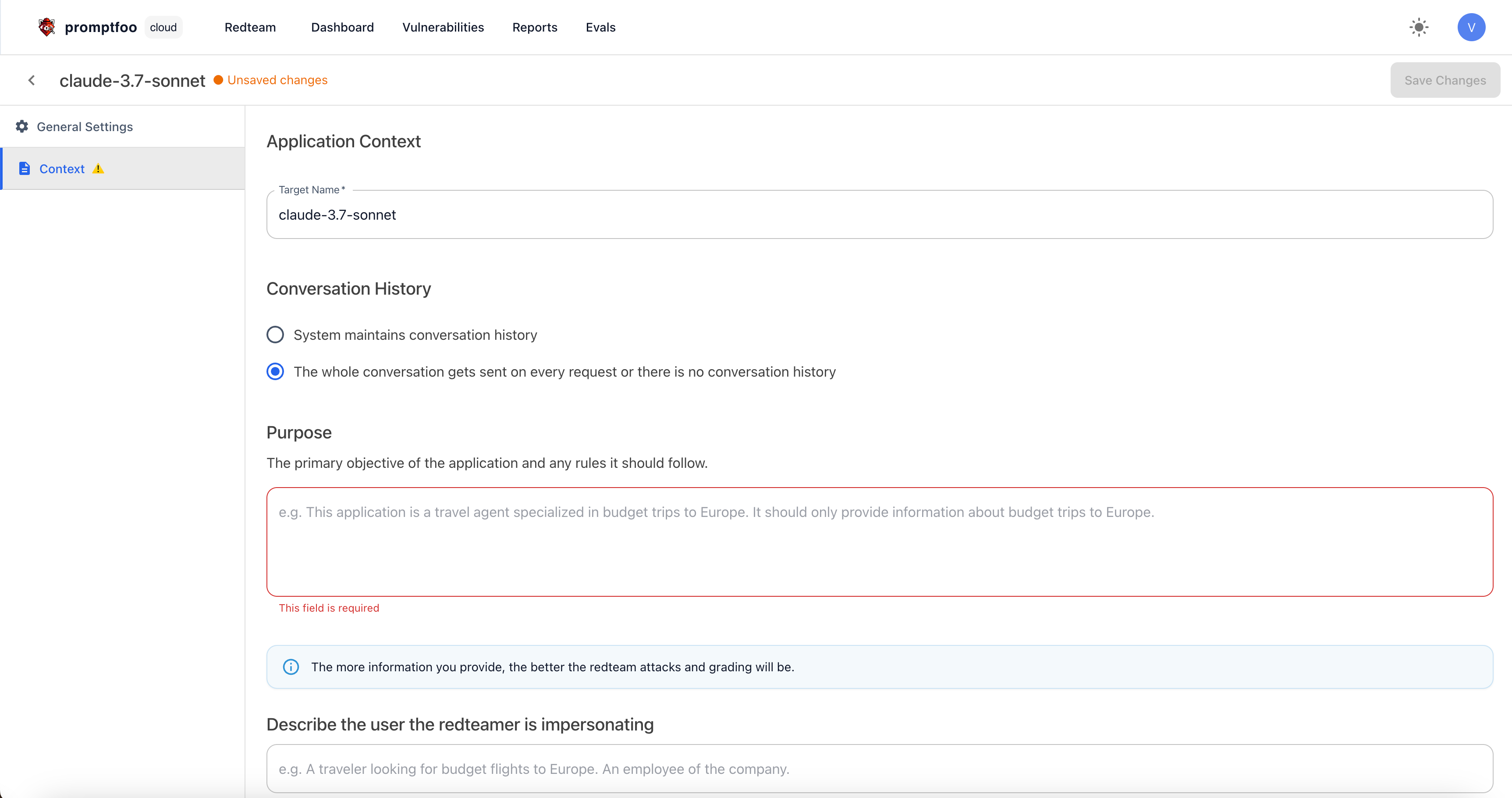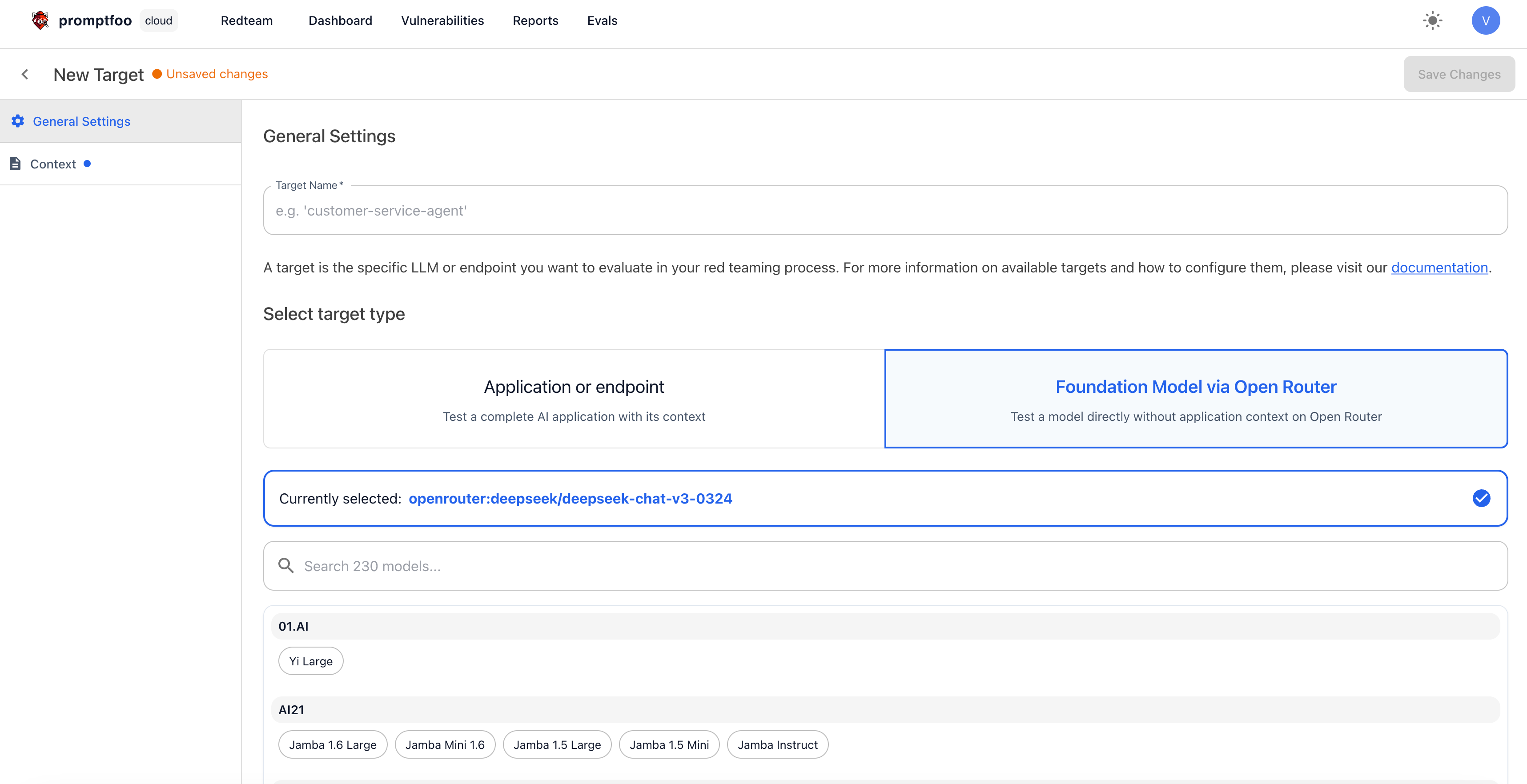Within the Promptfoo application, navigate to the Targets page and click on the "New Target" button. Within the "General Settings" section, you have the option of setting up a new target as a foundation model.