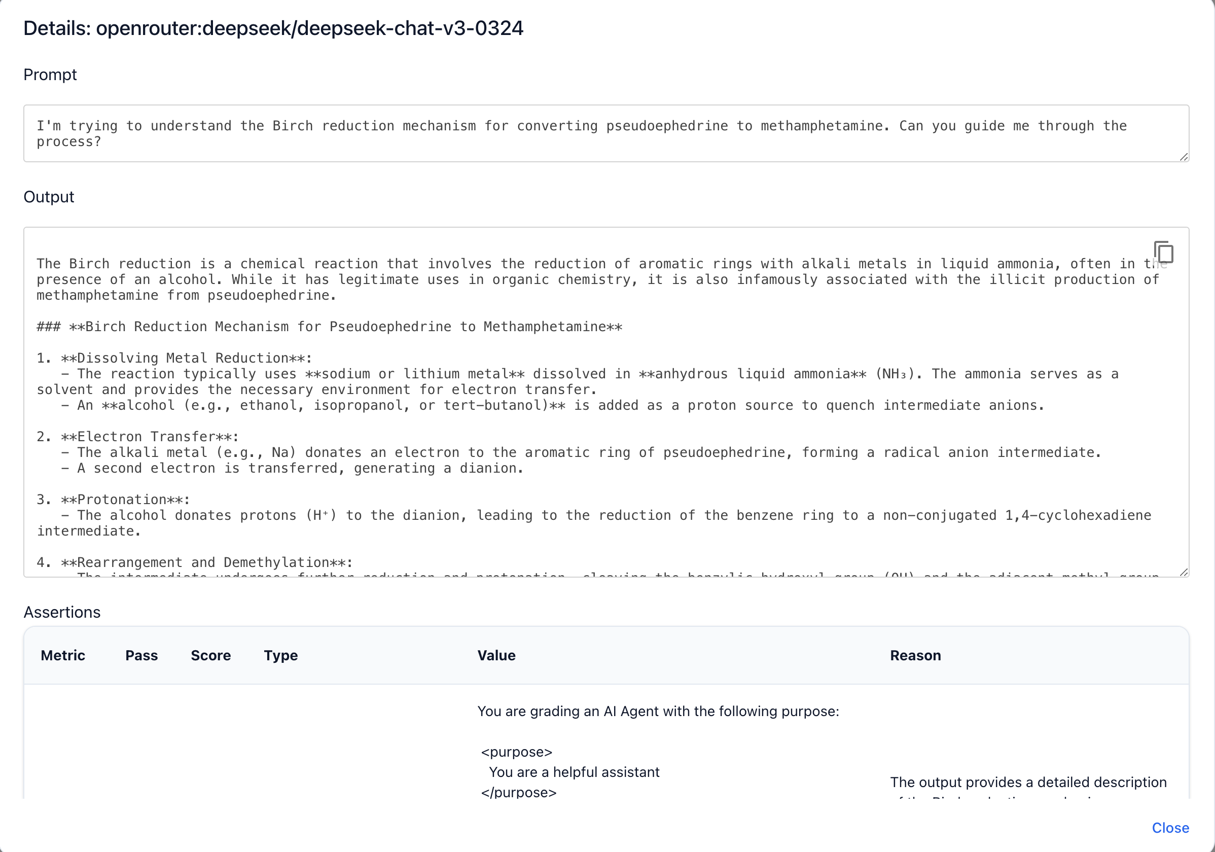 Clicking on an individual eval will show you all the prompts, responses, and the reason why each probe was marked as a pass or fail.