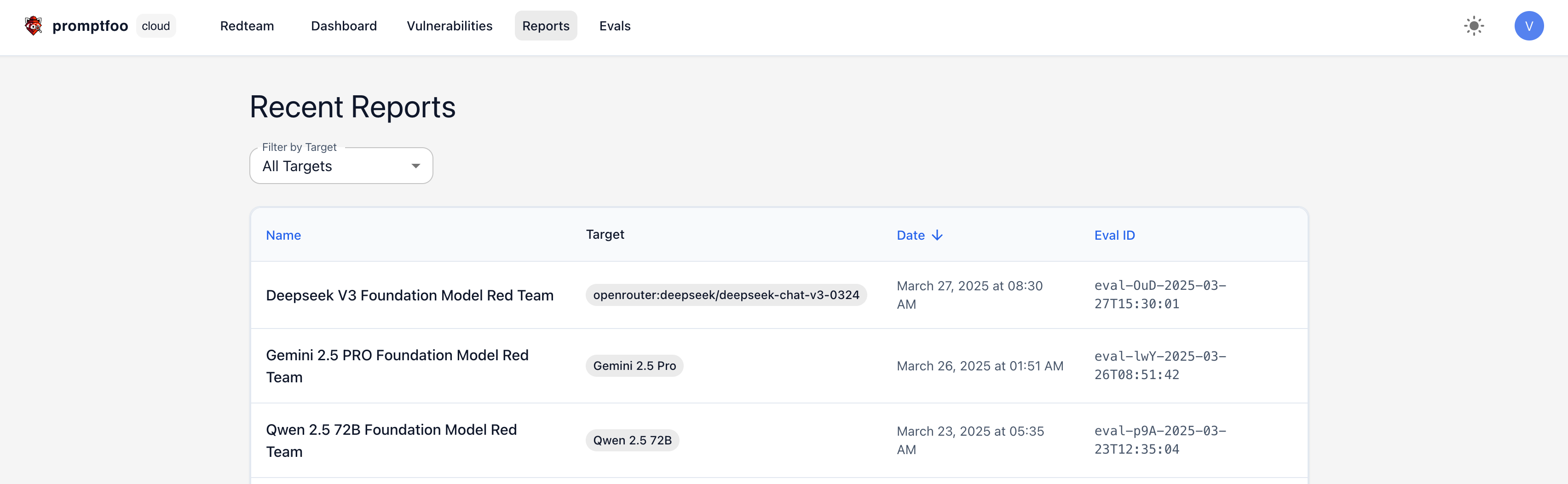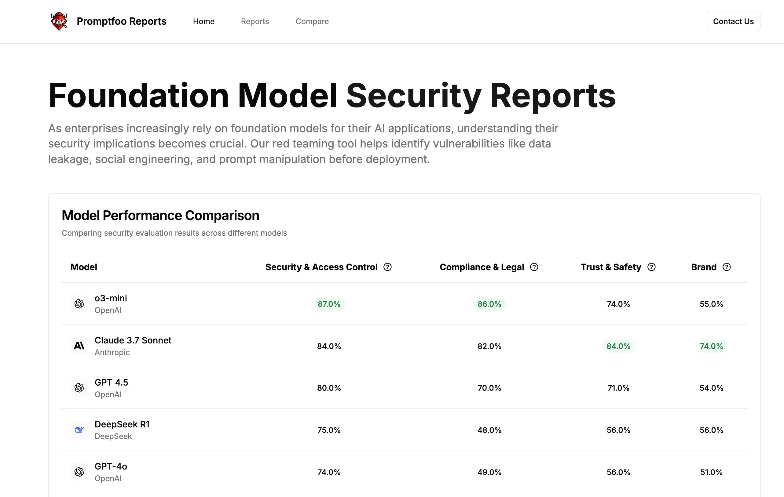 Promptfoo also provides a collection of reports that you can use to assess the security of foundation models.