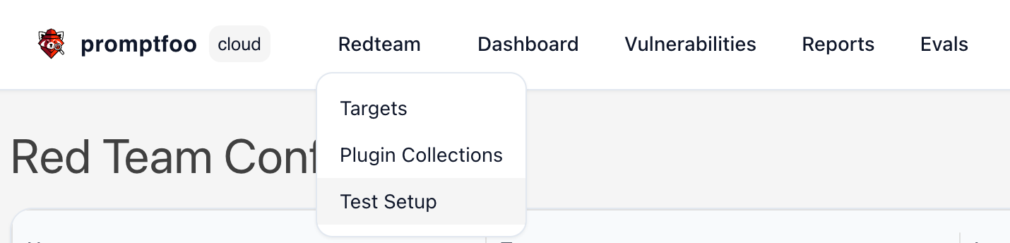 Once your foundation model target is saved, you can proceed to create a scan by clicking on the "Test Setup" within the Redteam dropdown.