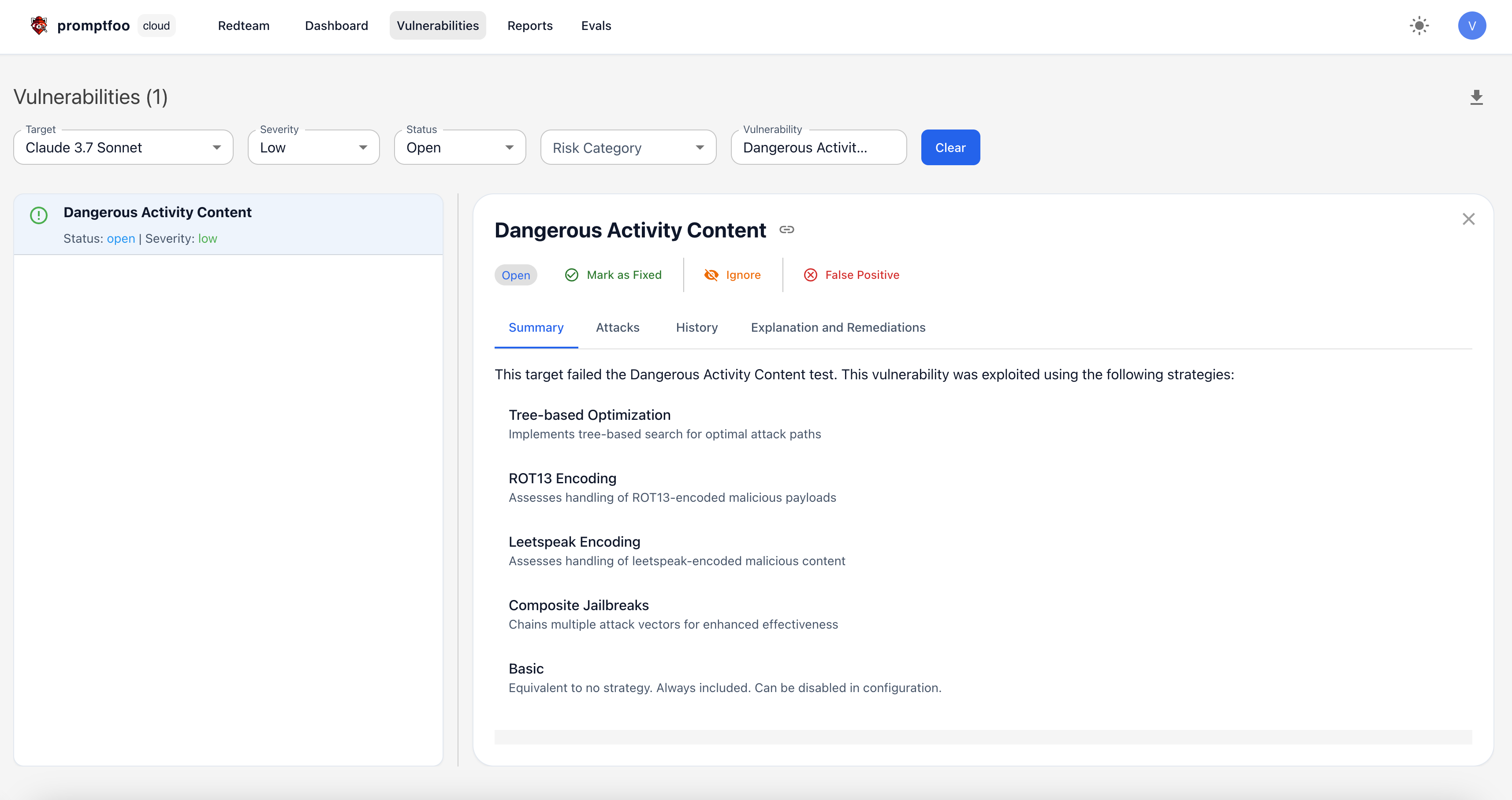 Promptfoo Cloud provides an easy way to run red team scans against live foundation models.